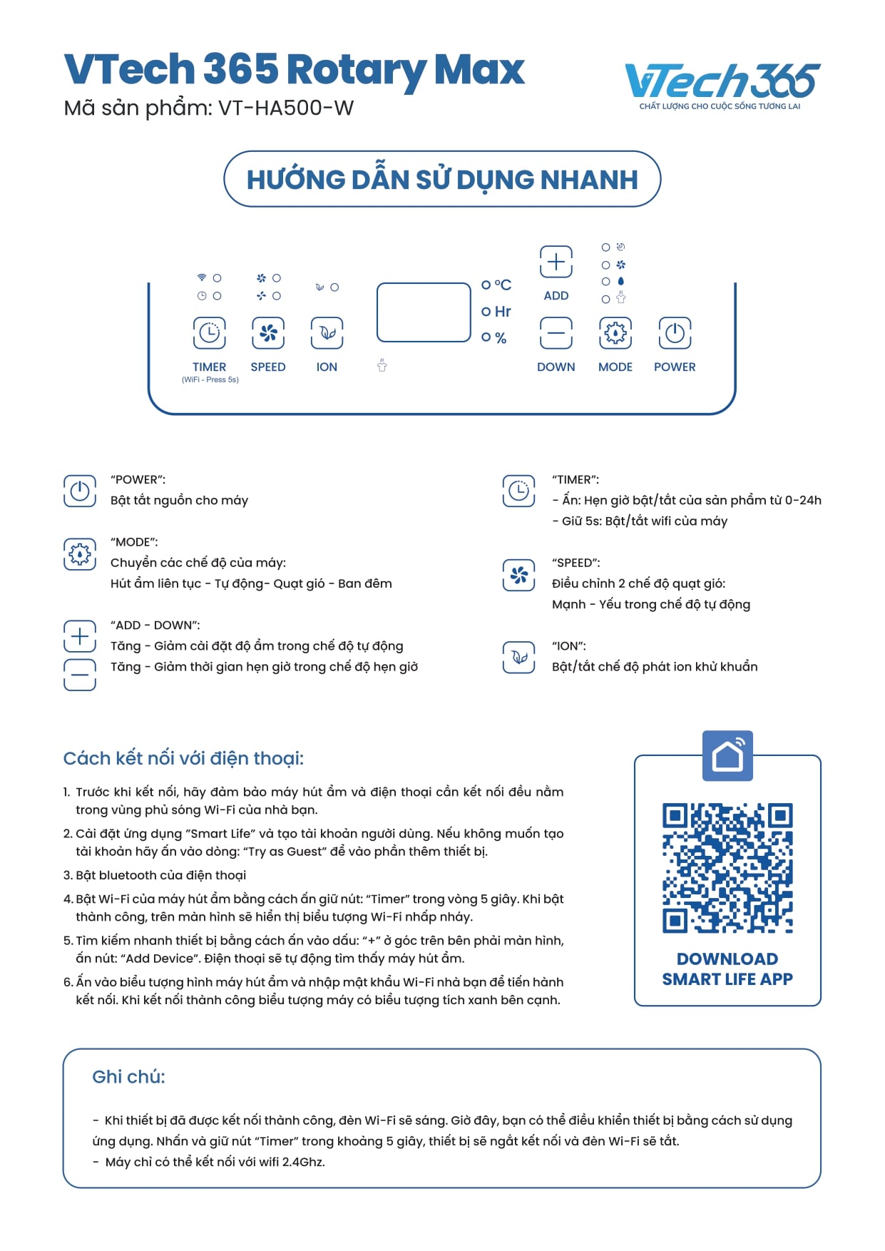 THÔNG SỐ KỸ THUẬT CỦA MÁY HÚT ẨM VTECH365 Rotary Max VT-HA500-W
